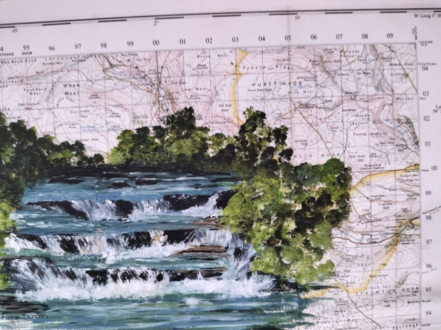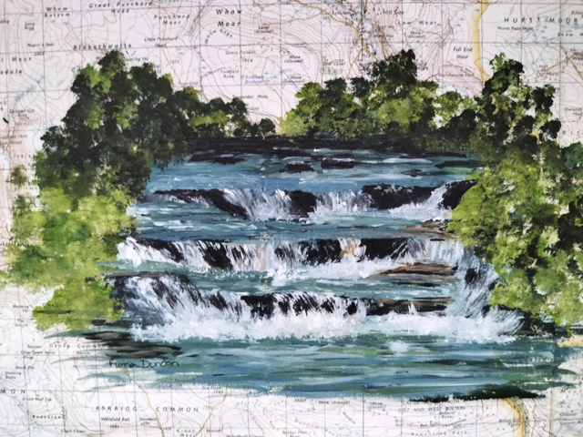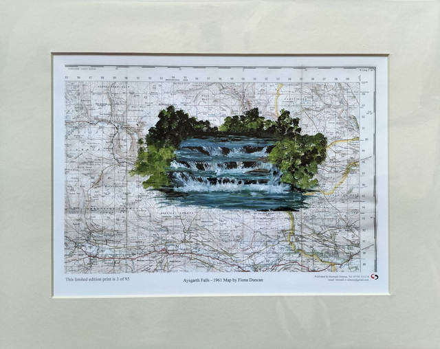 Limited edition print of Ayesgarth Falls in North Yorkshire, original painted on a 1961 vintage Map. 11x14 inches including mount