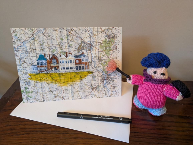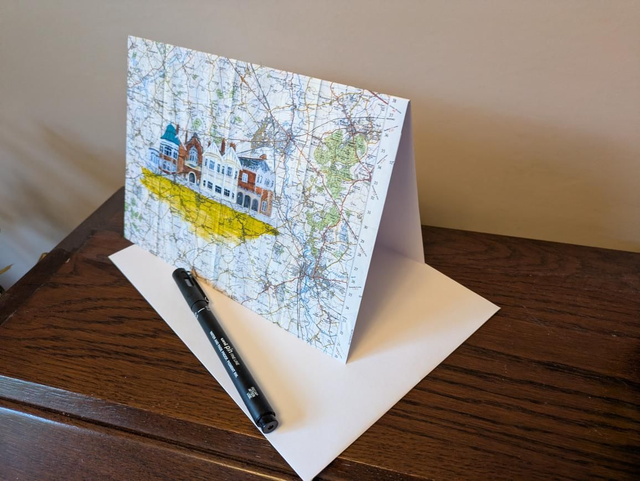 A greeting card featuring Bletchley Park in Buckinghamshire painted on a vintage map from 1968