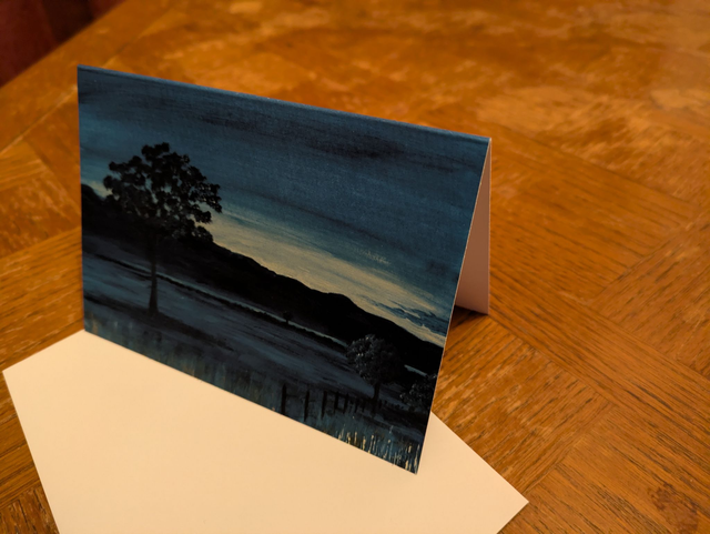 Early morning with sunrise just appearing above a range of hills with some trees in the foreground. This design was made using only 3 colours - Prussian Blue, Naples Yellow and Raw Sienna