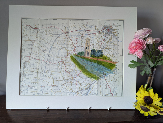 St Botolph's Church, aka Boston Stump in Boston, Lincolnshire with the river Witham running beside it, painted on an original vintage map from 1963.