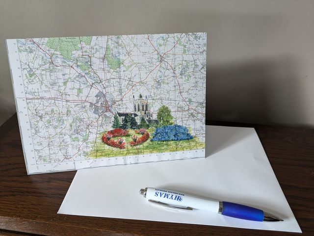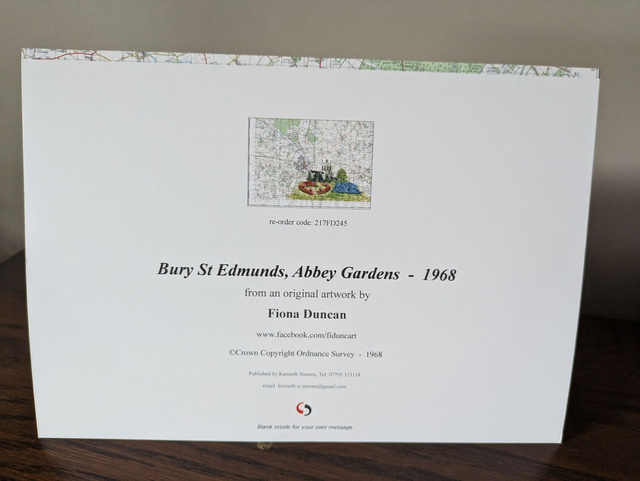Blank greeting cards featuring a 1968 vintage map with the abbey gardens of Bury St Edmunds, Suffolk, and the cathedral behind.