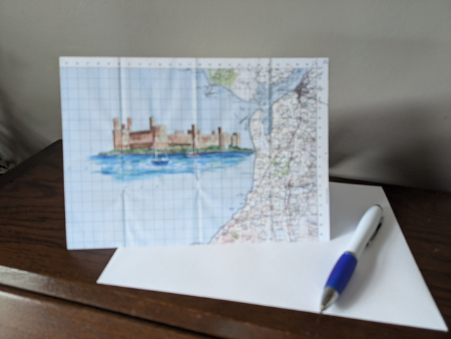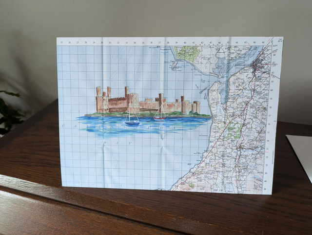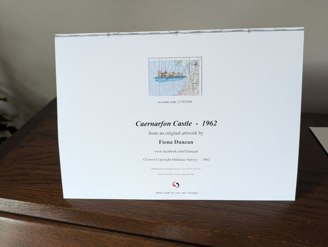 Blank greeting cards featuring Caernarfon Castle from a painting on an original vintage map from 1962. The folds of the map are still visible