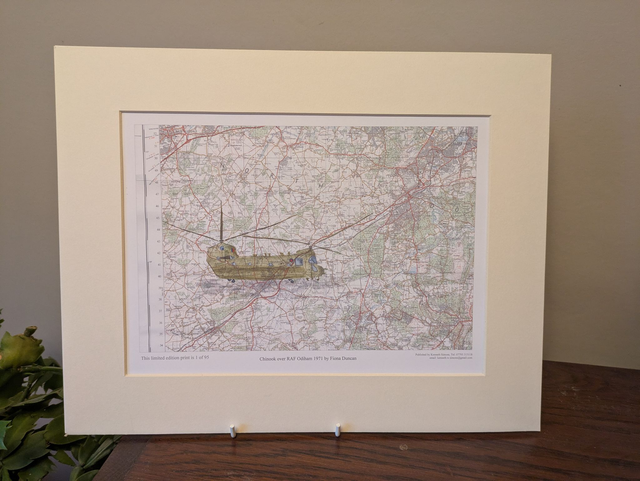 Print of a Chinook helicopter at RAF Odiham in Hampshire painted on a 1971 vintage map.