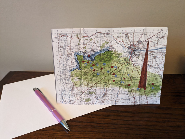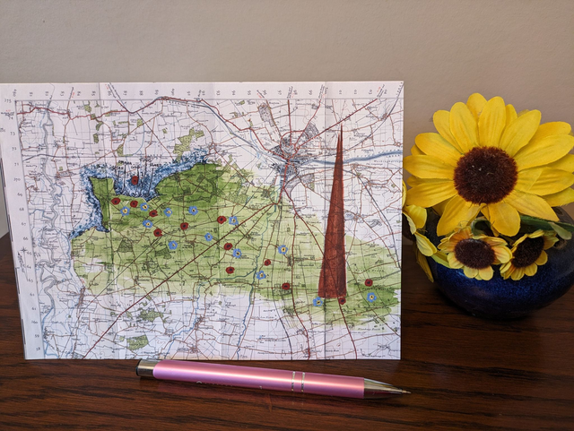 Blank greeting cards featuring a 1955 vintage map of Lincoln commemorating the 80th anniversary of the D Day Landings in Normandy with poppies and forget me not flowers (the remembrance flower for Germany) flowing from the coast of Normandy and the beachheads, towards the Spire of the International Bomber Command Centre, Lincoln.