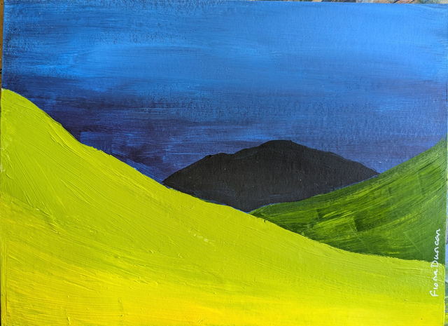 A small original painting featuring a range of mountains in various shades of green going from very dark up to yellow green.