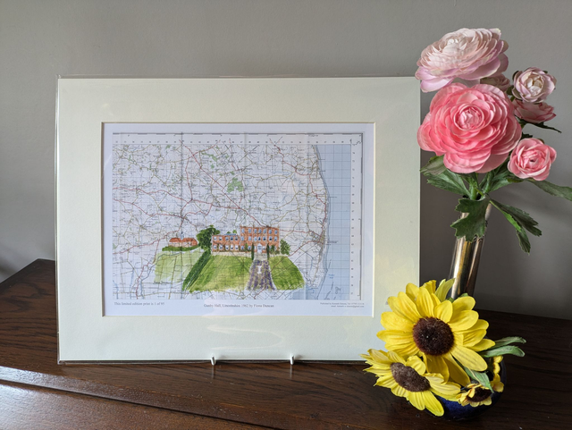 Gunby Hall and gardens in the Lincolnshire Wolds painted on a vintage map from 1962.