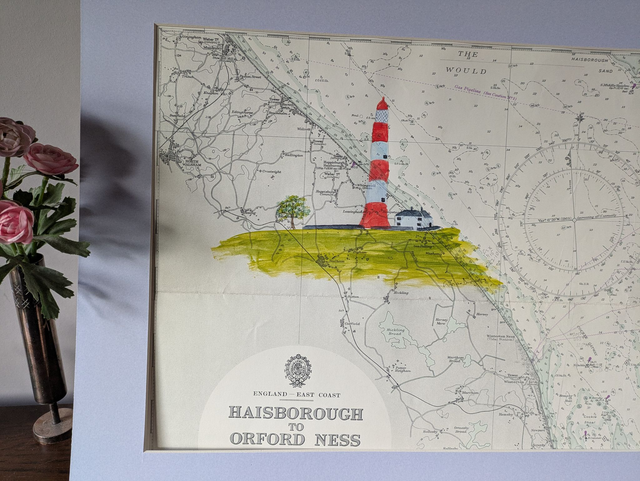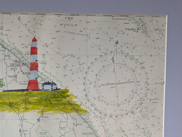 Happisburgh Lighthouse in Norfolk painted on an original vintage nautical chart from 1967. Unusually Haisborough is spelt 2 ways on this chart though I believe Happisburgh is more commonly used now. Taken from a larger chart which showed the coast down to Orford Ness, this painting only shows the northern part of this coast.