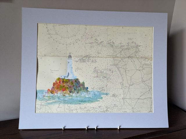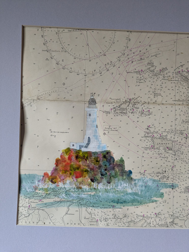 La Corbiere Lighthouse, Jersey painted on an original 1972 Nautical chart. Features the Cotentin Peninsular of France with the Channel Islands and part of the chart compass. The design has the lighthouse perched on rocks with the sea splashing around it.