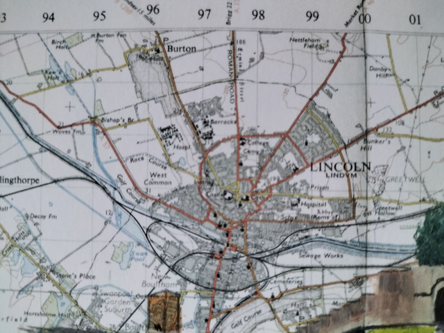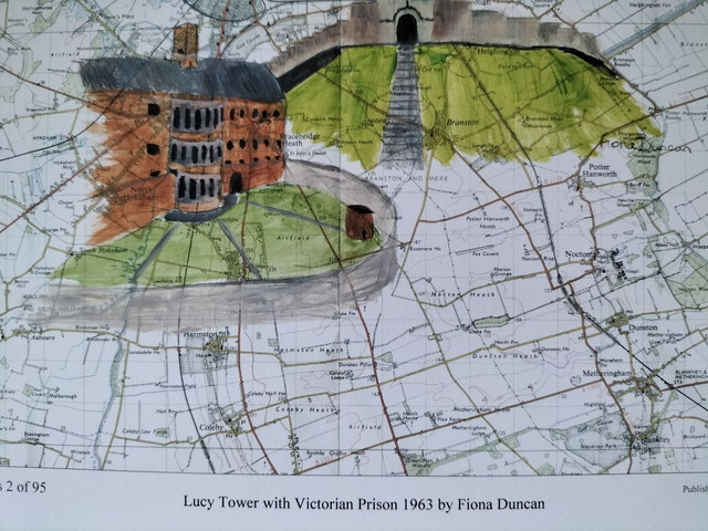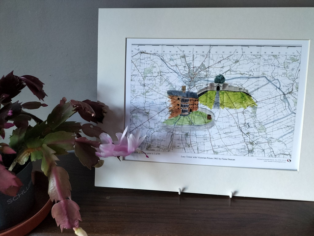 Limited edition print of Lucy Tower and the Victorian Prison at Lincoln Castle in Lincolnshire, original painted on a 1955 vintage Map. 14x11 inches including mount.