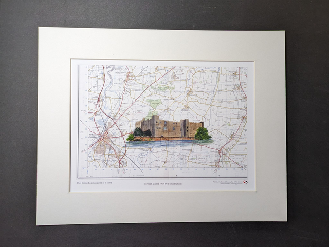 Limited edition print of Newark Castle, Nottinghamshire painted on a 1974 vintage Map