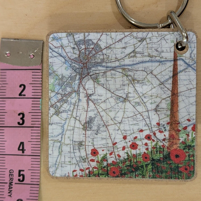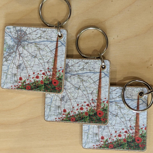 Key ring featuring the International Bomber Command Centre spire surrounded by poppies. Original painted on a vintage map from 1963
