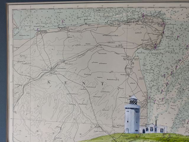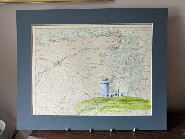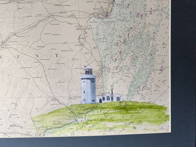 South Foreland Lighthouse in Kent painted on an original nautical chart from 1972