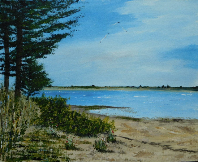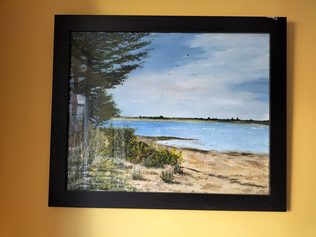 A framed acrylic painting on board featuring Spey Bay in Moray, Scotland. An area known for its stunning natural landscape