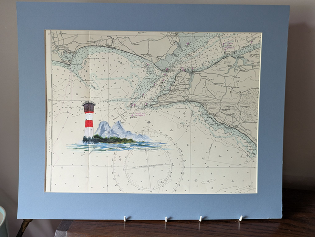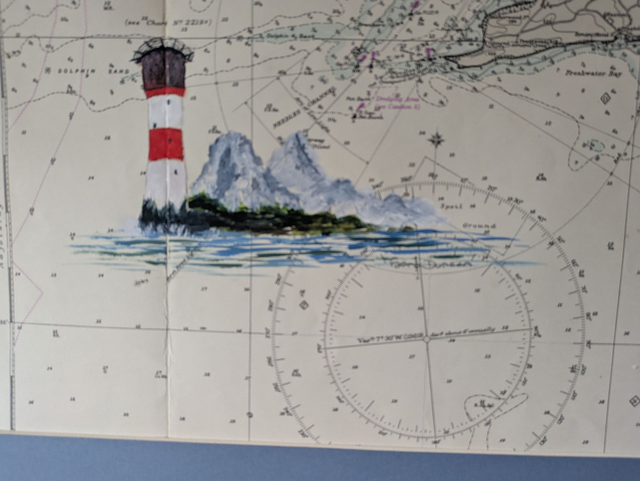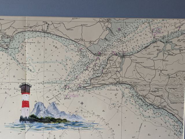 The Needles lighthouse off the coast of the Isle of Wight painted on an original nautical chart from 1962