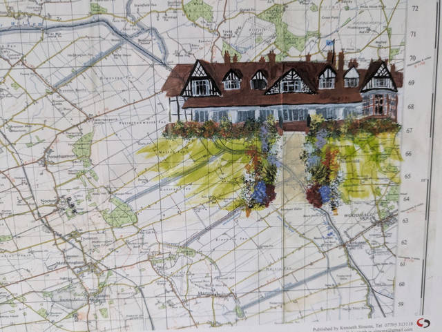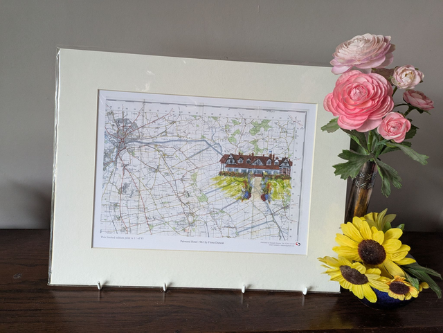 It was painted on a vintage map from 1963, the print measures 14x11 inches and includes the mount