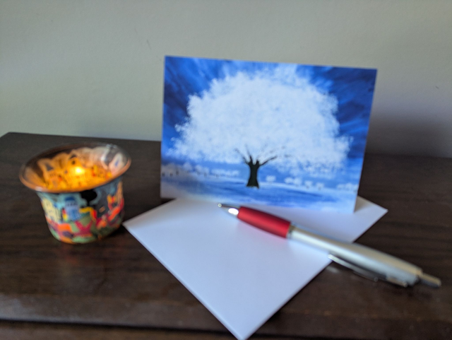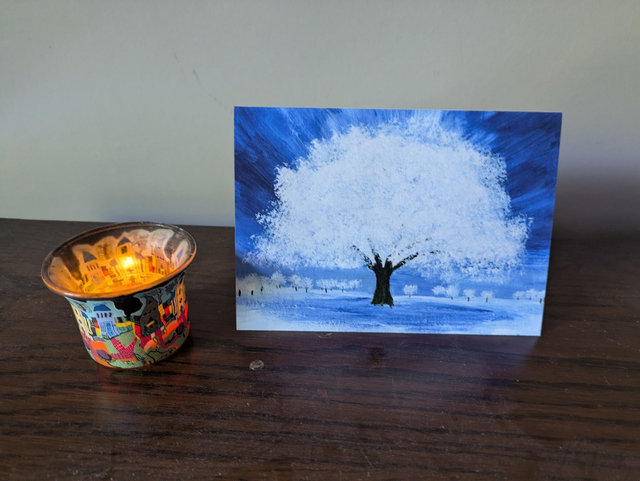 Pack of 6 Christmas cards featuring the Tree of Light standing in a field of snow