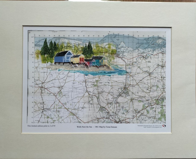 Wells next the Sea is a delightful seaside town on the north Norfolk coast known for its array of colourful beach huts. This is a print from original artwork painted on a vintage map from 1961.