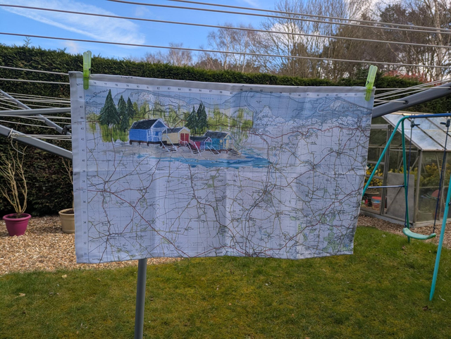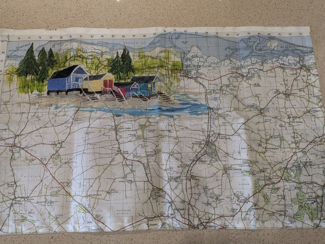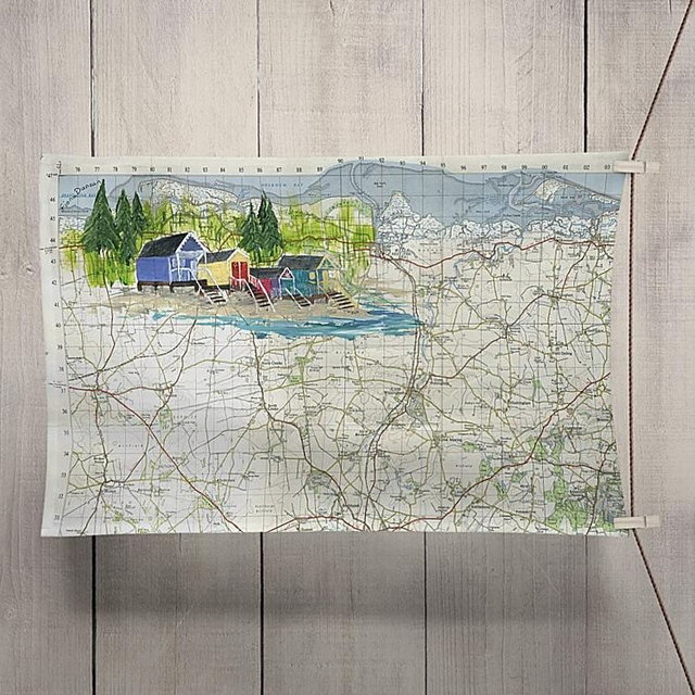 An organic cotton tea towel which features beach huts on the beach at Wells next the Sea in Norfolk. This was painted on a vintage map from 1961.