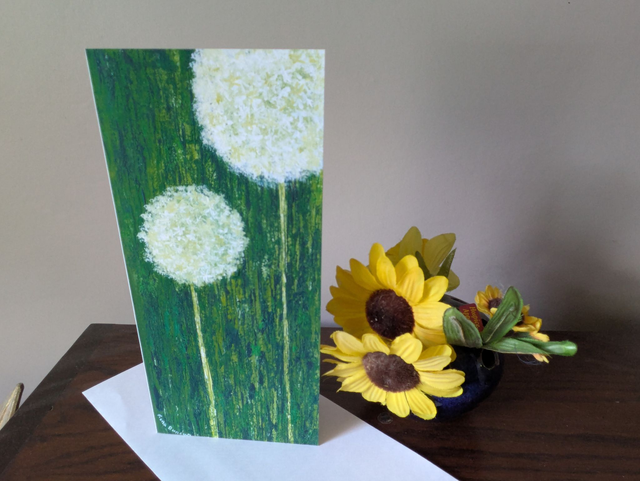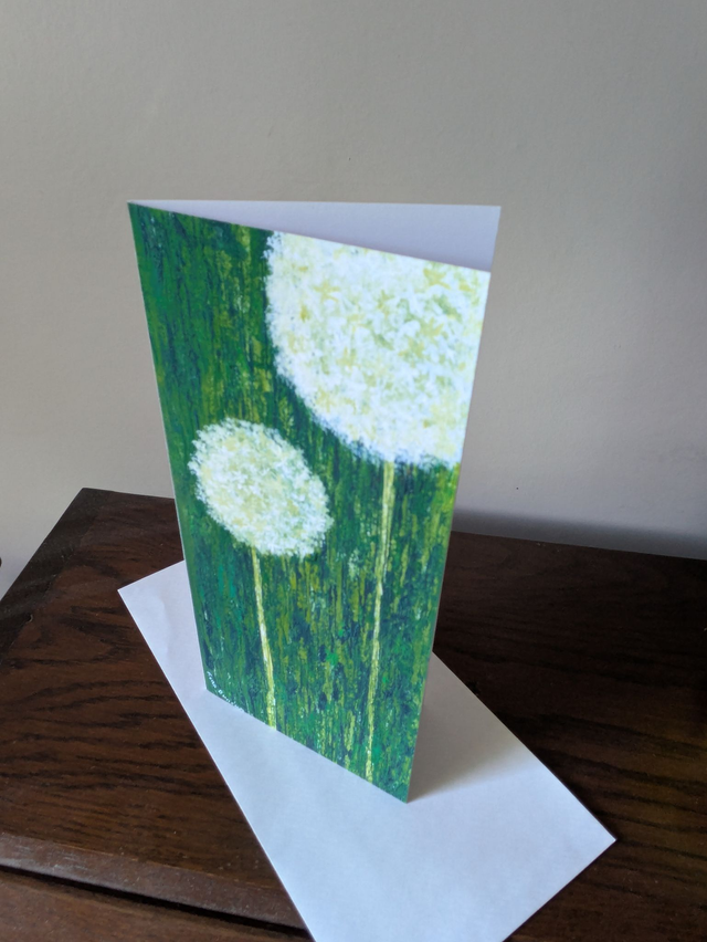White allium flowers on a mottled green background. Cards measure 10 x 21cm and come with an envelope and in a cello bag
