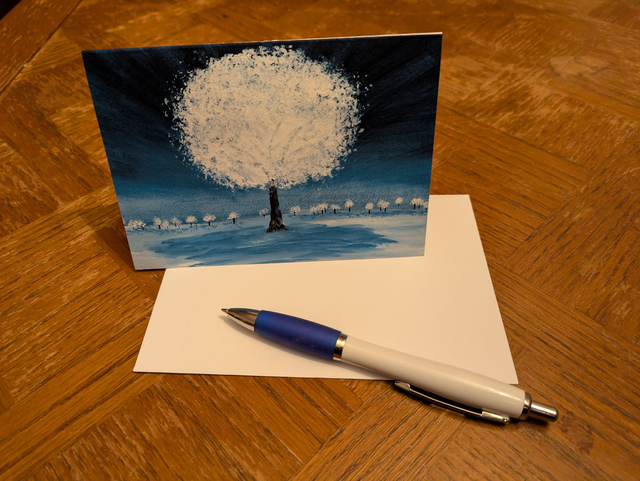 Greeting card featuring "Winter" a view of snow covered trees on a deep blue sky.